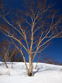 一面の白銀の地と真っ青な空にダケカンバの木が色添える。